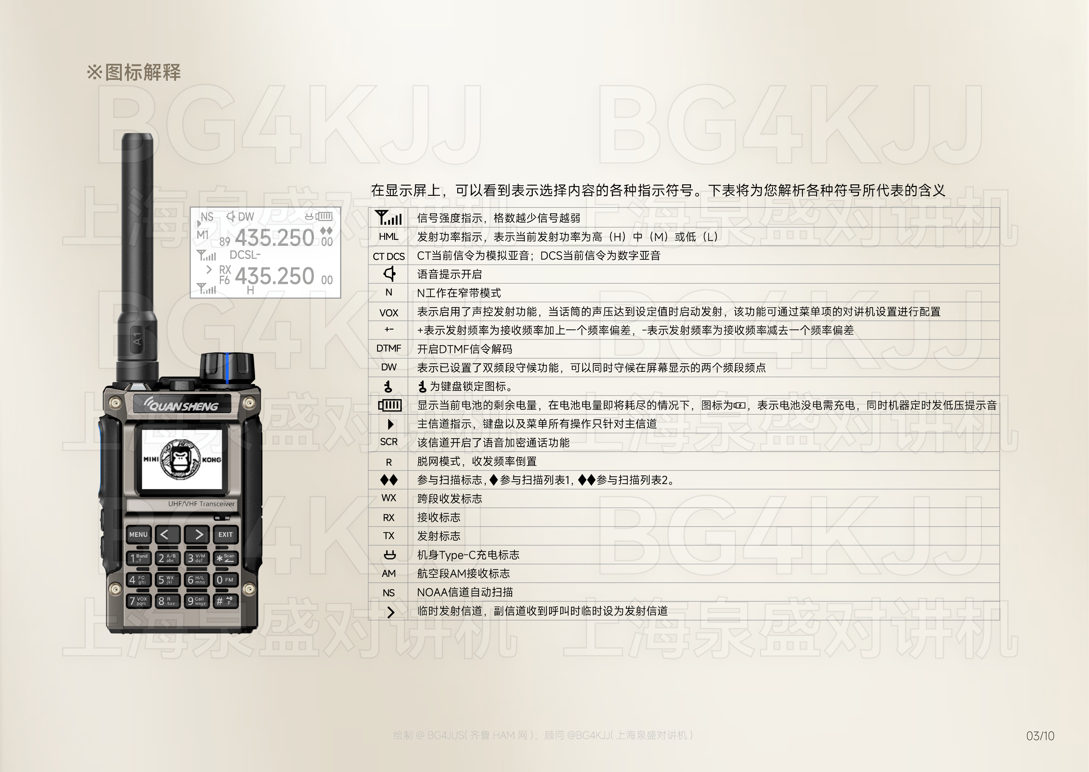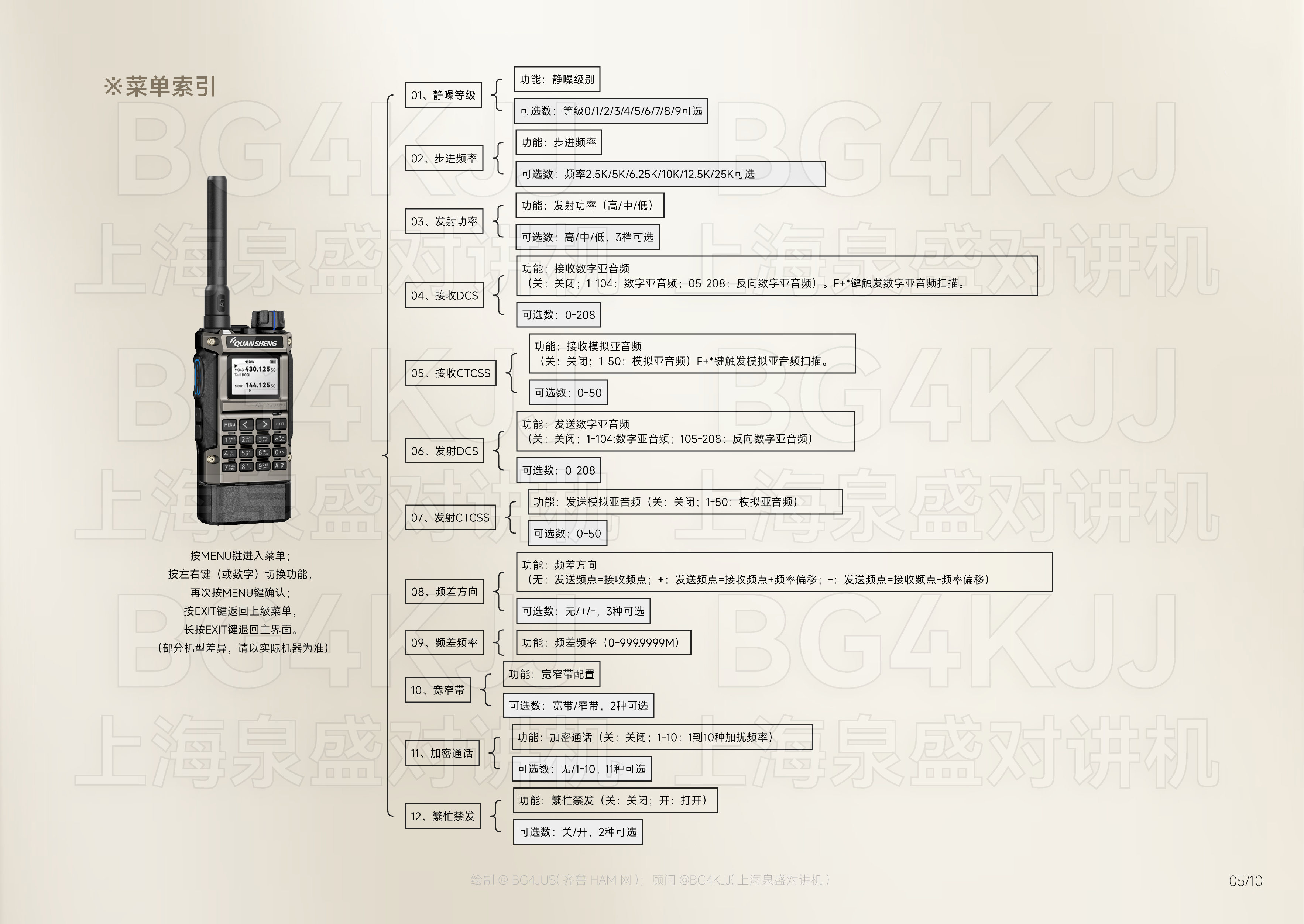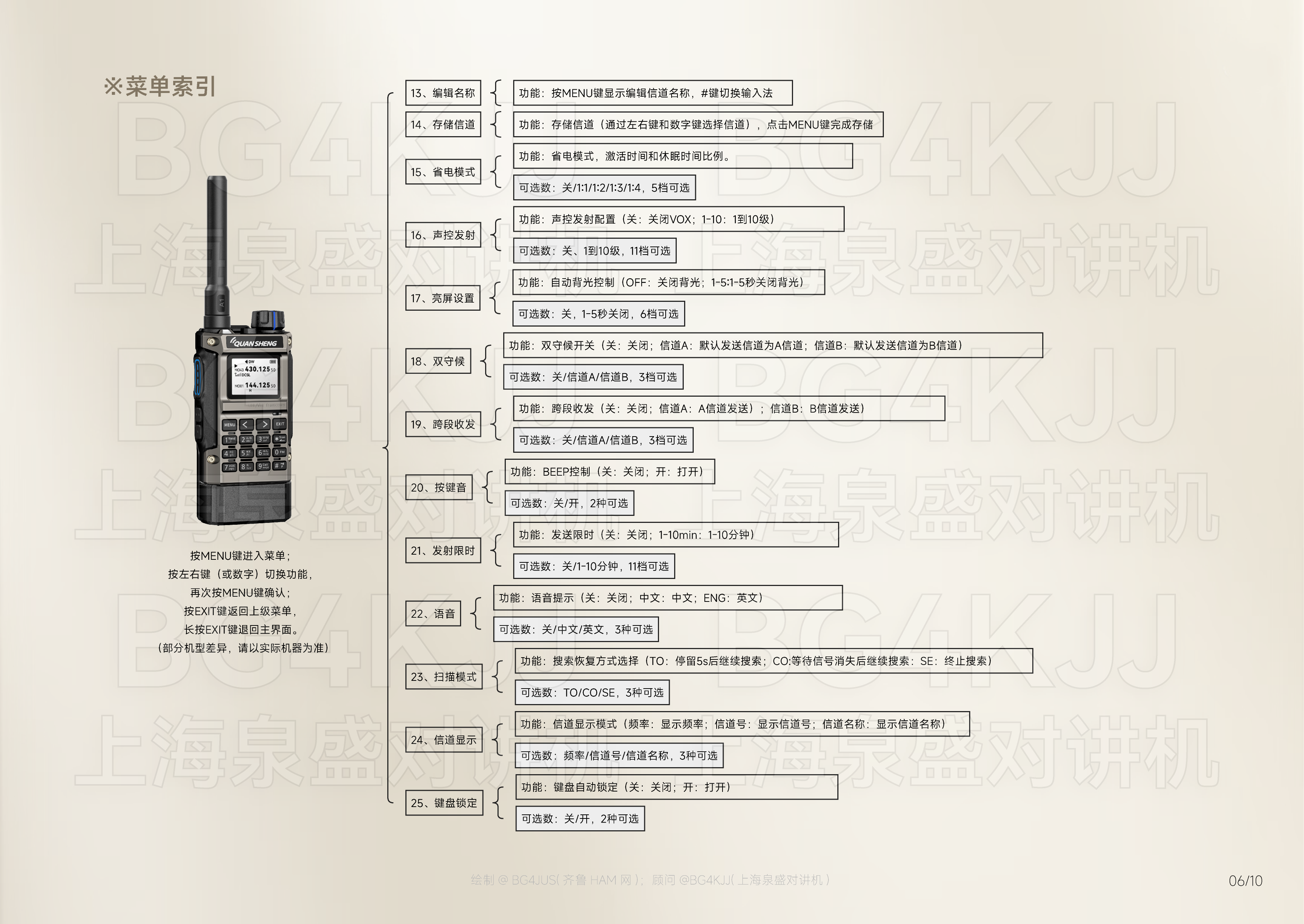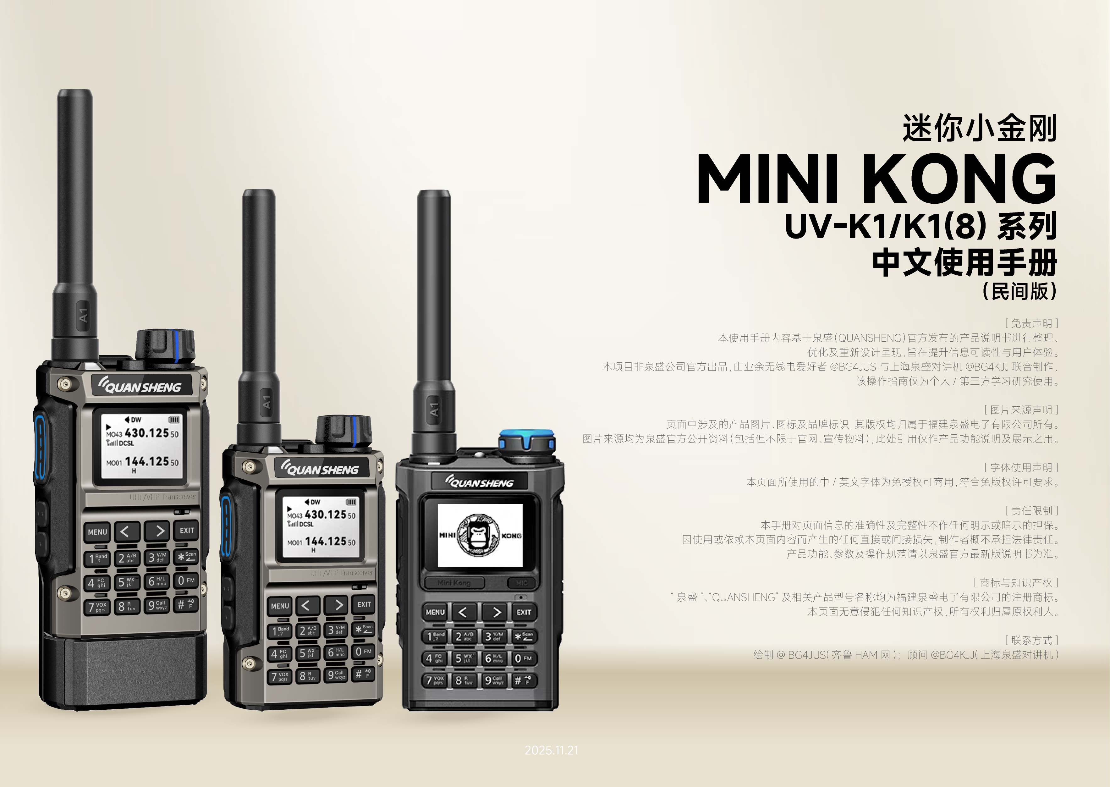 [免责声明] 本使用手册内容基于泉盛(QUANSHENG)官方发布的产品说明书 进行整理、优化及重新设计呈现, 旨在提升信息可读性与用户体验。本项目非泉盛公司官方出品, 由业余无线电爱好者@BG4JUS与 上海泉盛对讲机@BG4KJJ联合制作, 该操作指南仅为个人/第三方学习研究使用。