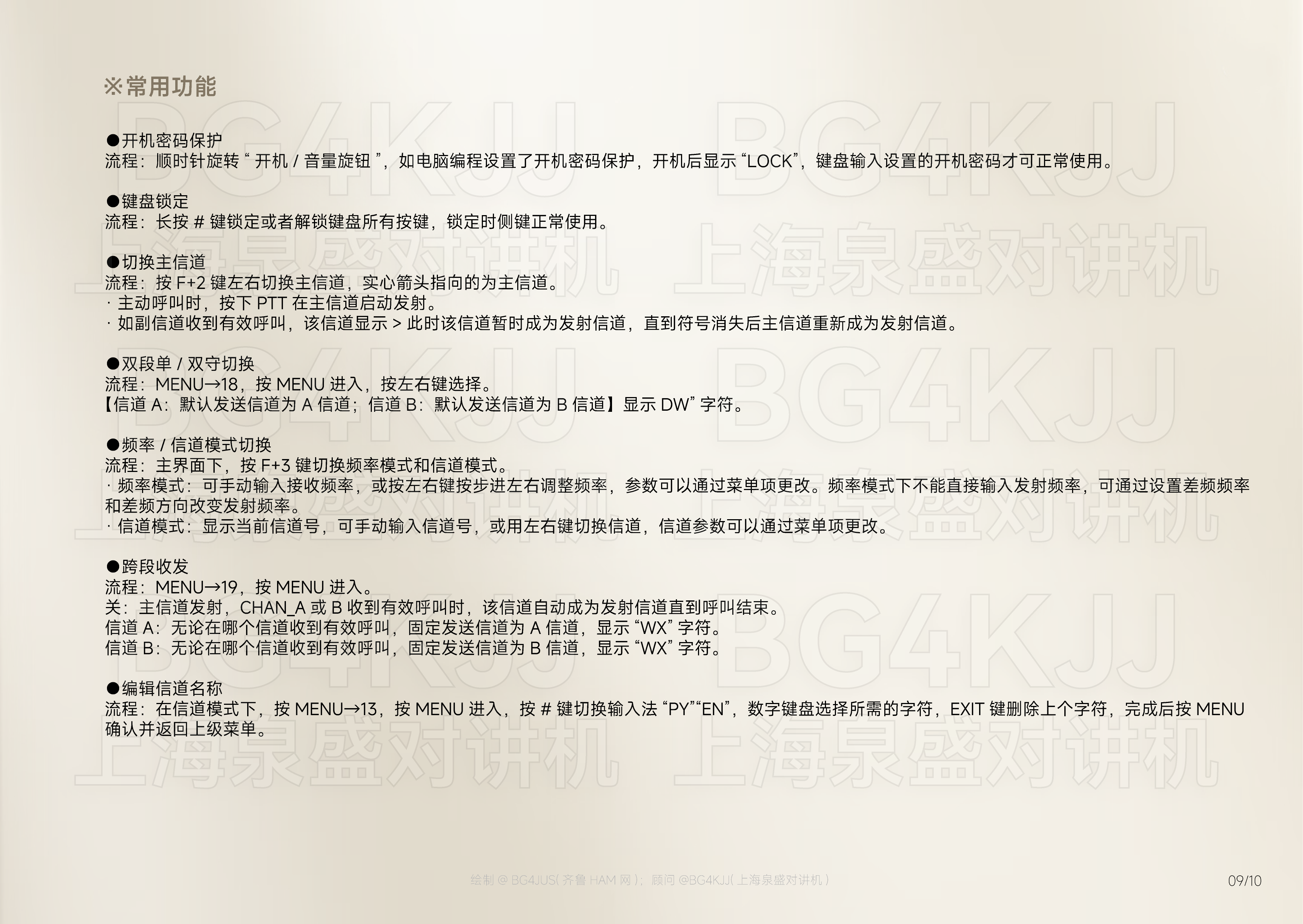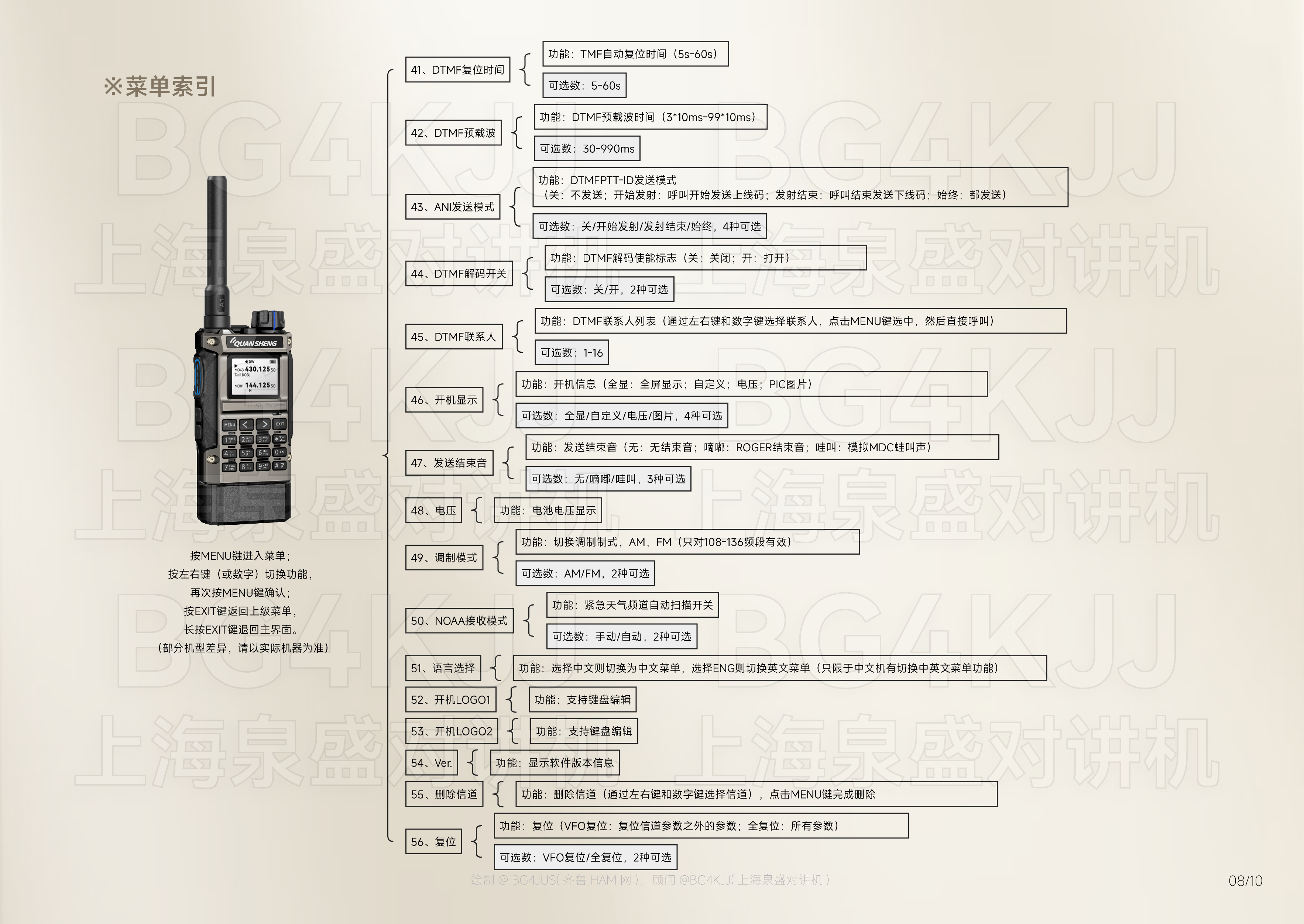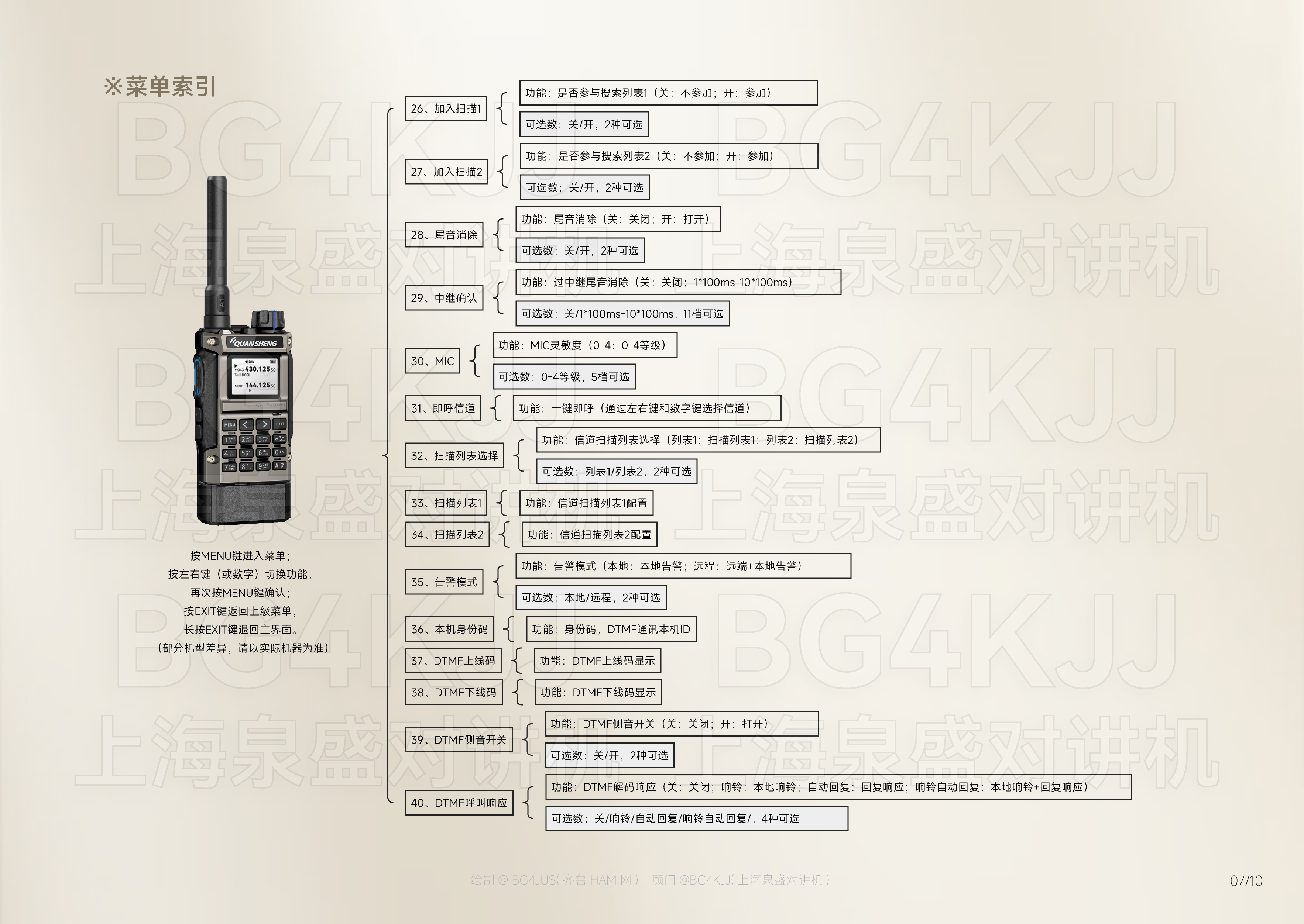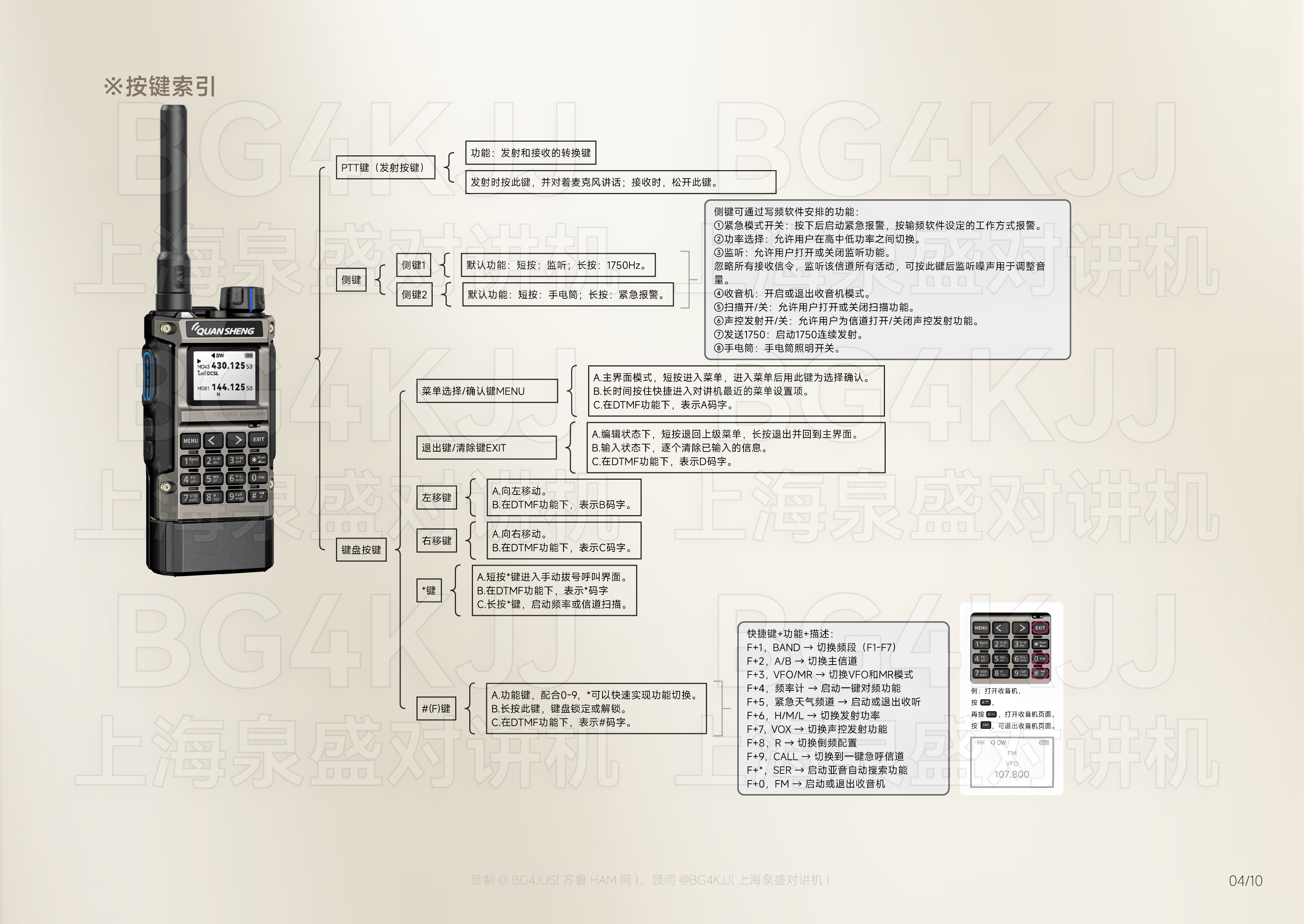 [免责声明] 本使用手册内容基于泉盛(QUANSHENG)官方发布的产品说明书 进行整理、优化及重新设计呈现, 旨在提升信息可读性与用户体验。本项目非泉盛公司官方出品, 由业余无线电爱好者@BG4JUS与 上海泉盛对讲机@BG4KJJ联合制作, 该操作指南仅为个人/第三方学习研究使用。